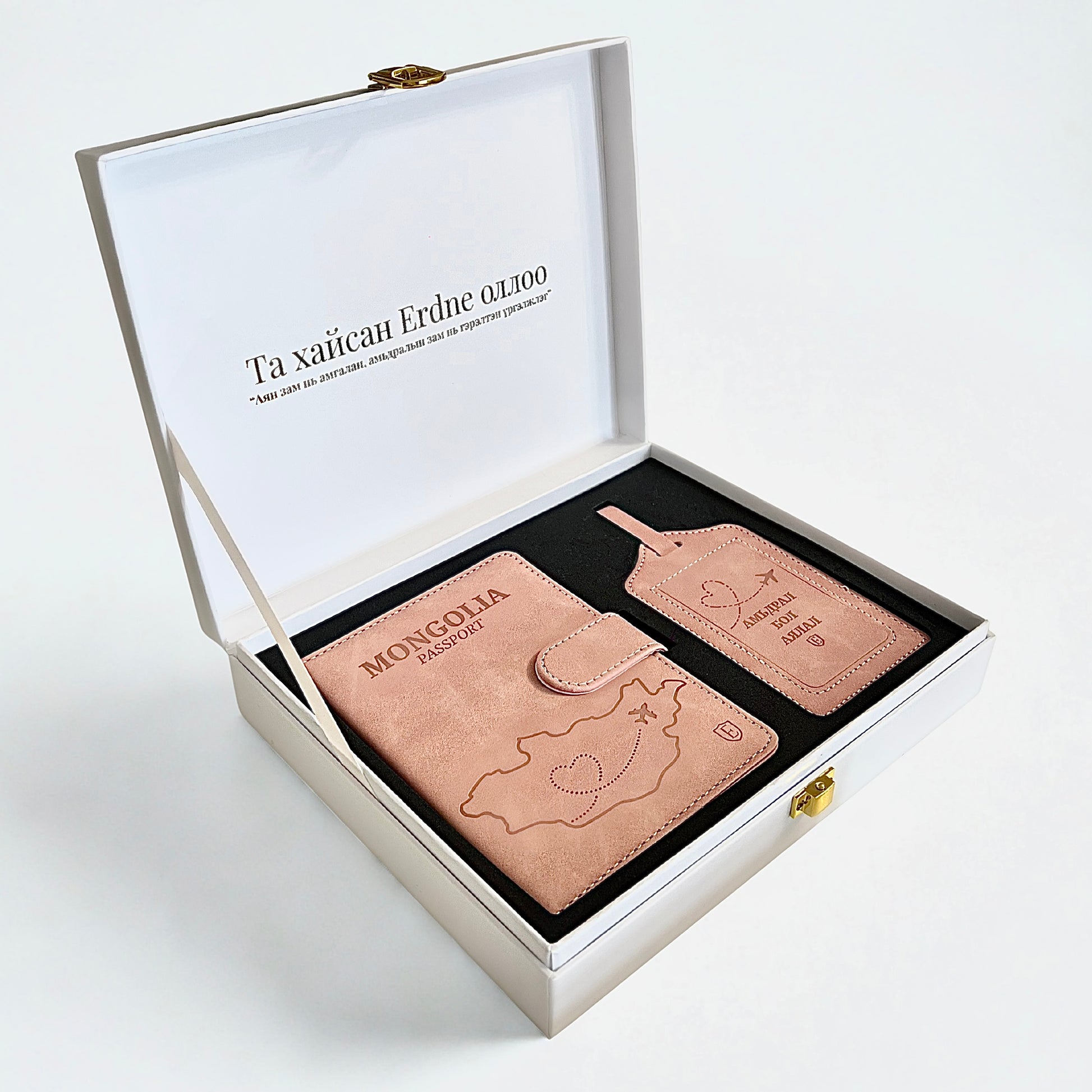 Монгол үндэсний онцлог шингэсэн загвар, гоёмсог хийцтэй passport holder болон luggage tag-ыг тансаг бэлгийн хайрцагт хийн танд болон таны хайртай хүнд зориуллаа.